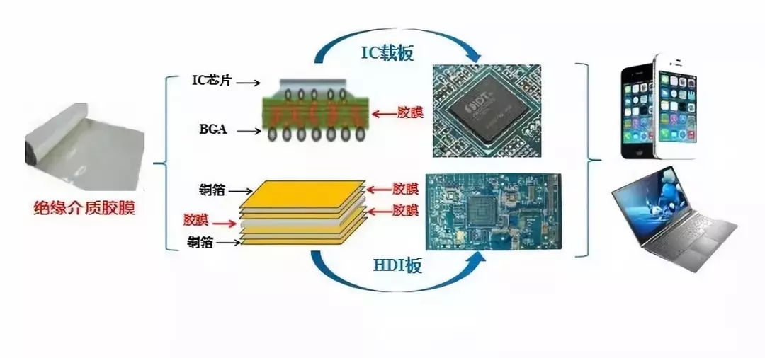 绝缘介质胶膜被应用在半导体芯片IC载板和高密度多层线路板封装领域,起粘结、导热和绝缘作用,是决定其性能的关键材料。