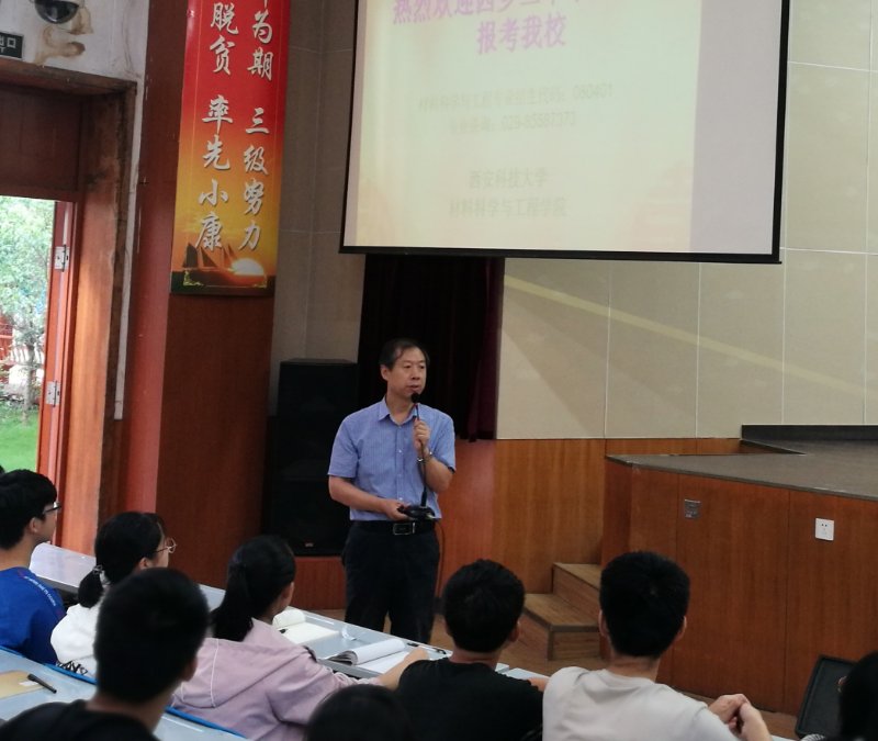 6月16日2026世界杯指定网站副经理朱明,刘向春教授,孙万昌教授,邓军平副教授一行赴汉中市西乡二中开展招生宣传。孙万昌教授为西乡二中员工做了题为“走近材料科学”的科普讲座,他结合专业特色,从社会、经济、科技发展等多个方面,介绍了材料对于社会进步的重大意义,也向全体同学宣讲如何选大学、选专业、公司人才培养优势及近年就业发展状况等内容。2026世界杯指定网站2016级西乡二中毕业生邓芳分享了丰富多彩的老员工活,同时也介绍了她身边同学近年来考研升学的录取情况。