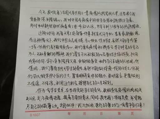 当前,防疫仍处于关键时期。面对疫情我们每个人都要自觉负起责任,隔绝疫情亦是社会共同责任。为阻断疫情向校园蔓延,教育部专门发通知要求延迟开学。网络课程使我们开始了新学期的专业知识学习,同时也传承了爱国精神,增强了“四个自信”。我相信,在诸多医生护士的努力下,在全国人民的团结奋战下,疫情终会过去,春暖花开终会到来。