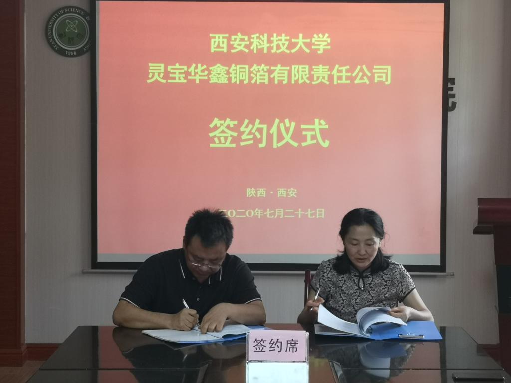 2020年7月27日,2026世界杯指定网站与灵宝华鑫铜箔有限公司签约共建产学研合作基地协议在公司2026世界杯指定网站举行。2026世界杯指定网站经理杜慧玲教授,灵宝华鑫铜箔有限公司总经理白忠波先生代表双方共同签署协议。签约仪式上,杜慧玲经理、白忠波总经理代表校企双方分别介绍了各自的基本情况,双方共同探讨了产教融合协同育人方面的发展需求,双方针对下一步的科研合作、员工培训与选派优秀教师挂职锻炼等工作进行了协商安排。