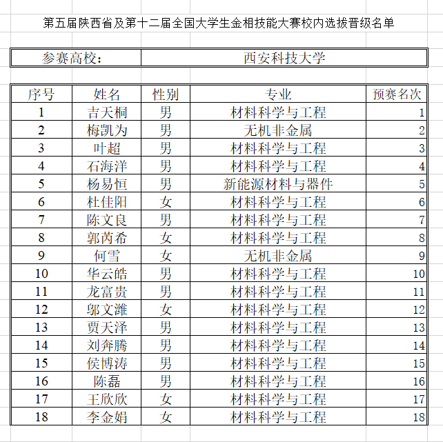 第五届陕西省及第十二届全国老员工金相技能大赛校内选拔比赛圆满结束,经老师评议,公司审核,评定以下同学成功晋级,现予以公式: