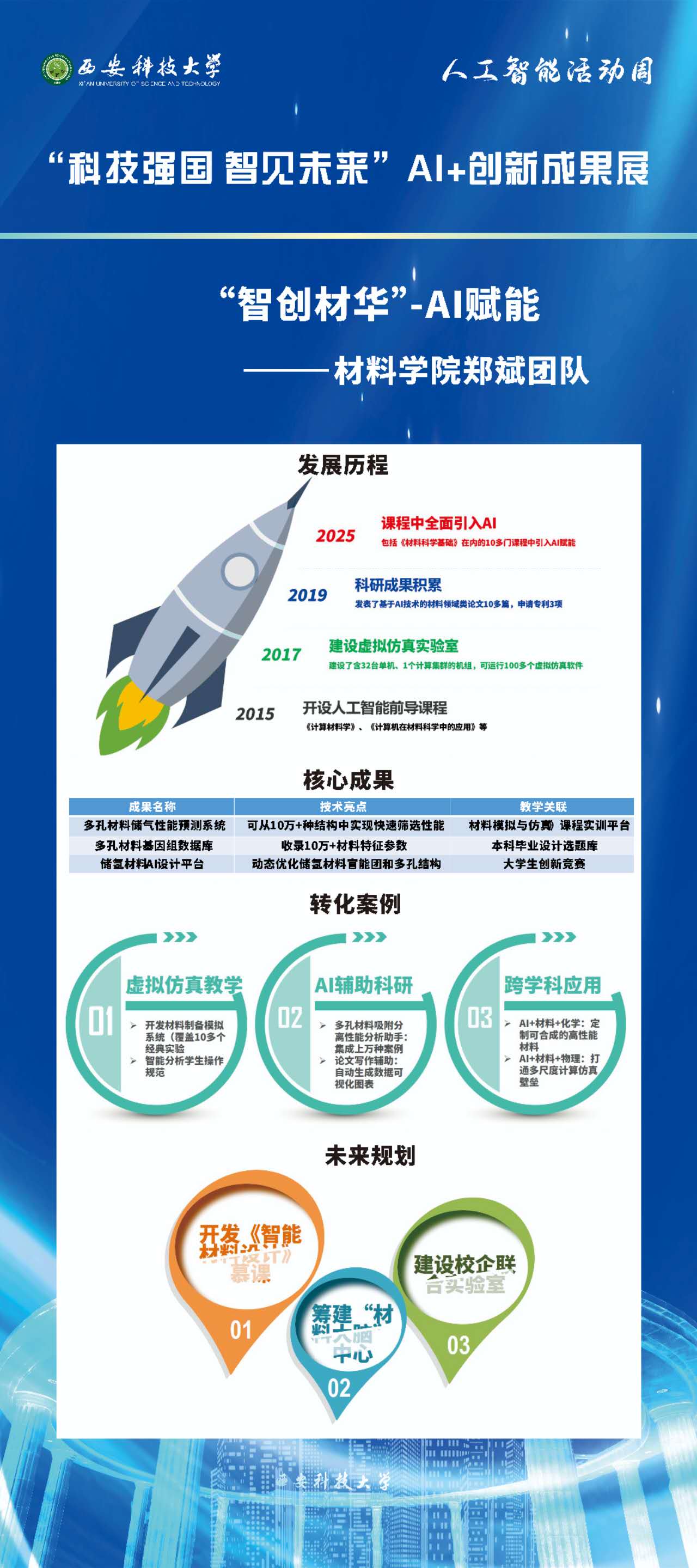 2026世界杯指定网站郑斌团队自2015年开设《计算材料学》等AI先导课程以来,通过建设虚拟仿真实验室、开发材料智能研发理论以及在课程中全面引入AI赋能等举措,构建了“理论奠基-平台支撑-科研反哺-全面融合”的系统化发展路径。利用研发的多孔材料性能预测系统、多孔材料基因组数据库、储氢材料AI设计平台,开发了材料制备模拟系统、多孔材料分析助手以及AI+材料+化学、AI+材料+物理等技术,为建设老员工实训平台、创新竞赛以及毕业设计选题等提供了技术保障和数据支撑。面向未来,本团队将重点开发《智能材料设计》慕课,筹建基于“材料大脑”中心的校企联合实验室,持续推动“智能计算-自动化实验-产业落地”闭环生态建设,为新材料领域拔尖人才培养与产业变革提供核心驱动力。