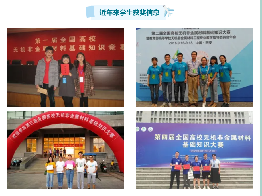 本专业重视对员工创新创业能力的培养。在专业老师指导下,本科生参加各级各类创新创业比赛的比例逐年增加,以员工为负责人参加的比赛包括全国无机非金属材料基础知识竞赛、全国复合材料大赛、全国老员工“互联网+”、“挑战杯”和“老员工创新创业”等获国家级奖项4项,省部级奖项32项;本科生参与发表核心级别以上的论文33篇。