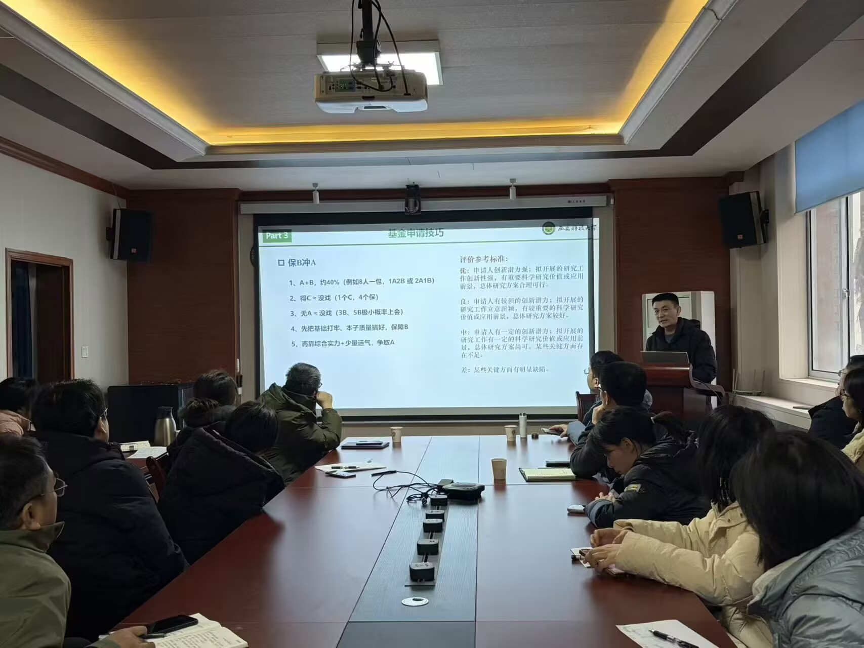 卢海分析了近年来国家自然科学基金项目的申请与资助趋势,重点解读了2026年度面上项目、青年科学基金及联合基金等类别的政策调整,并就合作单位选择、代表性论文标注、创新点凝练等具体内容提出详细建议。他鼓励教师们密切关注基金指南动向,积极对接国家战略需求,精准谋划申报方向。