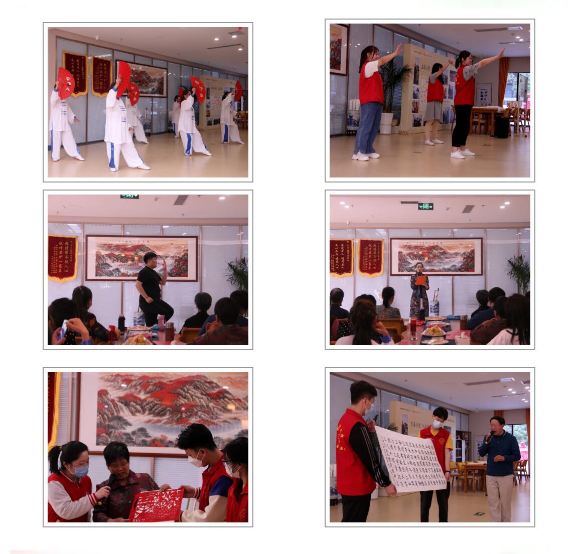 老人们为同学们展现太极的妙处,经典的诗朗诵让同学们更加珍惜自己的青春年华;同学们为老人们带来流行歌曲、热门舞蹈和富有青春活力的诗歌,让老人们回忆起自己当年的青葱岁月。表演结束后,同学们和老人们聊起了天,老人们回忆起了当年青春岁月,讲述自己平淡而不平凡的一生。有的老人给同学们展示他们的剪纸技艺和的书法。至此,本次活动圆满结束。